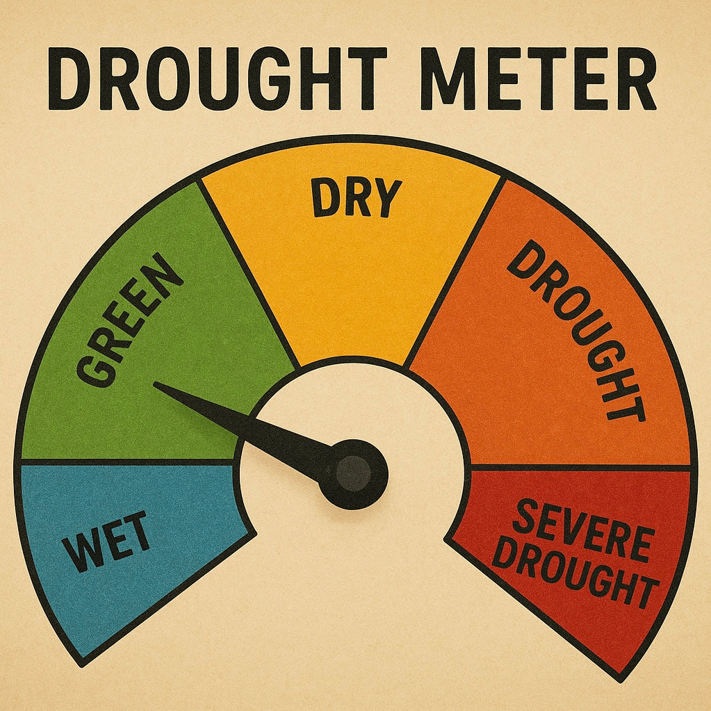Please note: Hollyhock Hill’s ‘Drought Meter’ is an independent assessment of past weather in Ballarat, based on rainfall over the previous 3 calendar months using data provided by the Bureau of Meteorology. It is not a forecast of future weather. It is not an indicator of longer-term hydrological conditions or of any drought declarations made by the Bureau of Meteorology, Central Highlands Water, or any other Government departments.