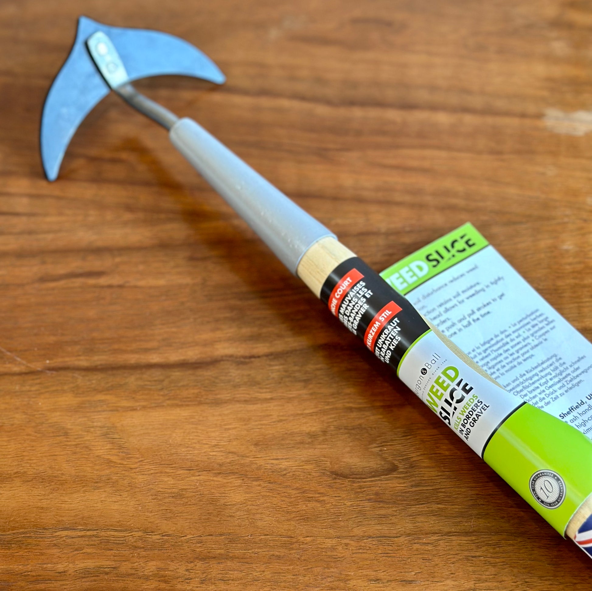 Unlike a traditional hoe, which chops down through the soil, Weed Slice is used just under the surface, where the sweeping curves of the head easily slice through weed roots and tender shoots. This technique minimises soil disturbance and helps the soil retain that all-important moisture. The hardened high-carbon steel head cuts on both the push and the pull strokes, to get weeding done in half the time.