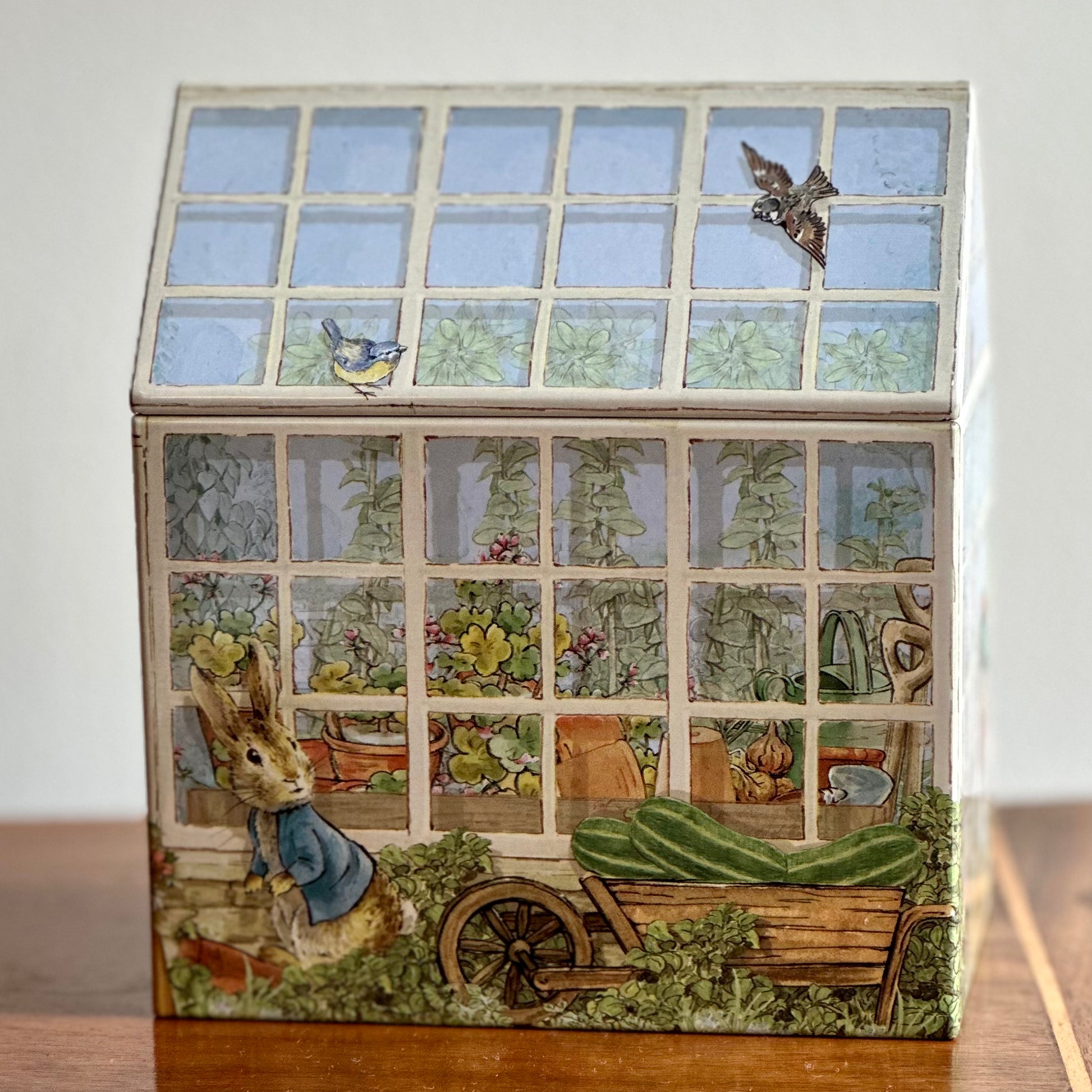 Featuring the classic and beloved Peter Rabbit by Beatrix Potter, produced under licence by Elite Tins. Peter Rabbit Greenhouse tin with lid.