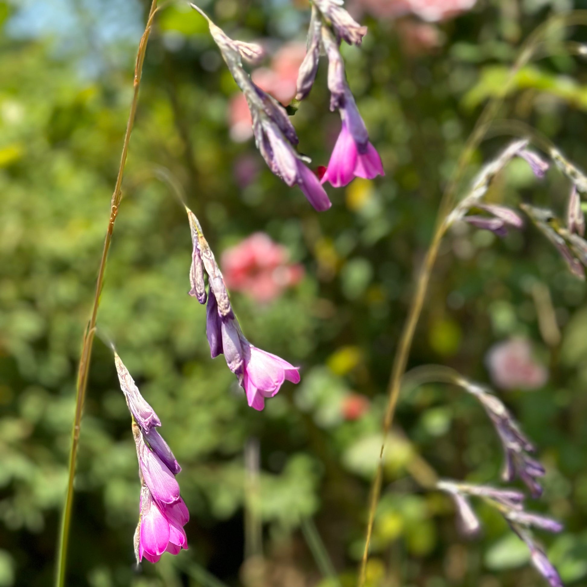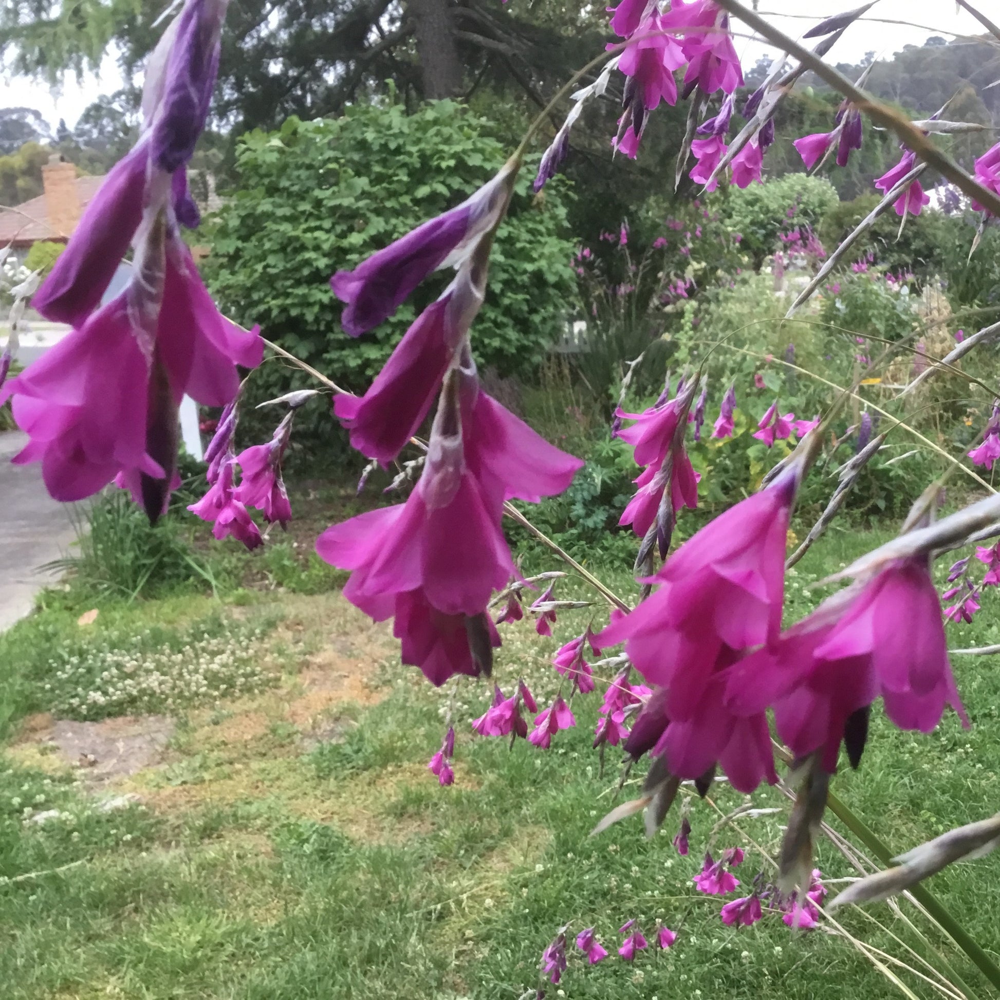 Native to South Africa. A clump-forming perennial producing spectacular arches of deep pink bells in summer.