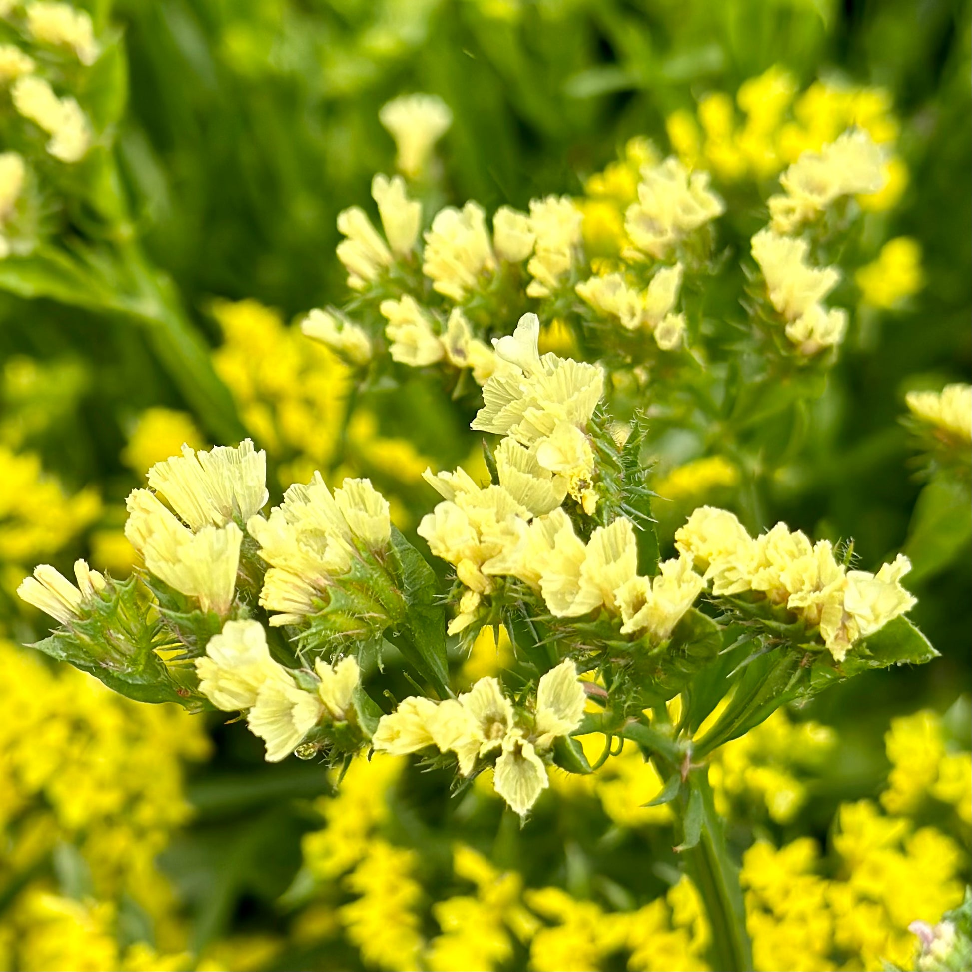 Soft, papery flower clusters on strong stems in pastel shades of blue, yellow, white, apricot, lavender and rose, blooming all Summer long. One of the best flowers for drying and holds colour well. Perennial often grown as an annual. Height up to 80cm. Drought tolerant once established. Full sun. Sow direct or in seed trays in Spring and plant out after last frost. Sowing depth: 6mm.